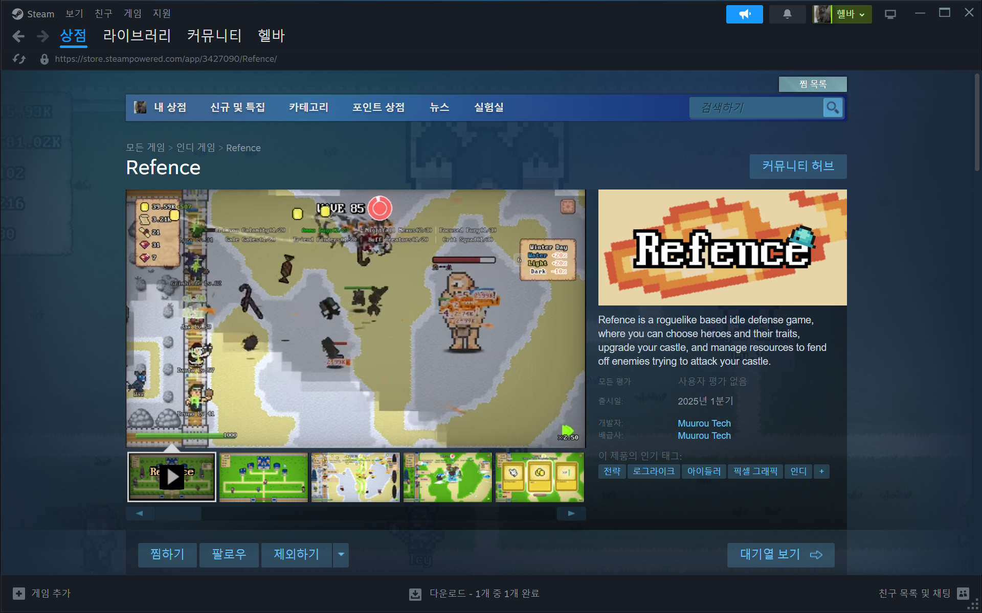 게임 Refence는 로글라이크 요소를 기반으로 한 방어형 방치 게임으로, 자신만의 성을 방어하기 위해 다양한 영웅들과 특성을 선택하고, 성을 업그레이드하며 자원을 관리하는 재미를 제공합니다. 이 게임은 여러 방어 전략을 구사할 수 있는 기회를 제공하며, 플레이어는 시간을 들여 점차적으로 강력한 방어를 구축해 나갑니다.